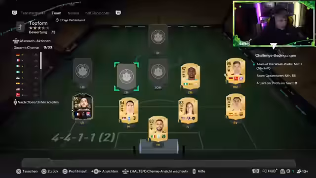 00:59:42Es wird über den Abschluss der nächsten SBC gesprochen, wobei POTM Wirtz als absolutes Muss hervorgehoben wird, da er auch Stürmerpositionen besetzen kann und über fünf Sterne Weakfoot sowie gute Playstyles verfügt. Es wird erwähnt, dass einige Spieler ihn aufgrund des Preises als zu teuer empfinden könnten. Die Schwierigkeit, gute Special-Karten zu ziehen, wird thematisiert, wobei der Streamer sein Glück beim Ziehen von Alba hervorhebt. Es wird überlegt, ob BBM-Karten für 200 weggehen könnten. Der Kroos-Abschluss wird als zufriedenstellend beschrieben, und es folgt der Versuch, Kimmich zu ziehen, wobei stattdessen Ona Batlle und später Raffinha gezogen werden. Die Packs werden insgesamt als super für Infos bewertet. Es wird kurz auf den Story-Modus auf der PS5 und die Kosten für Online-Spiele eingegangen.