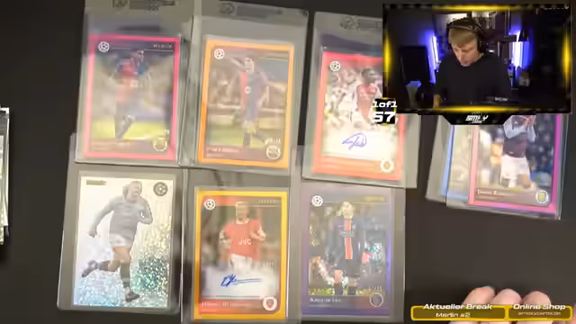 00:21:18Die Pack-Opening-Session startet mit der ersten der 12 Boxen im Case. Nachdem die Streamer Kopfhörer aufgeladen und die Musik angepasst hat, beginnt das gemeinsame Auspacken. Die Karten werden sofort gezeigt und teilweise kommentiert, wie ein Refractor-Parallel von Antonio Rüdiger oder die seltene 30-jährige Anniversary Card in der ersten Box. Der Streamer erwähnt die Notwendigkeit, alle Karten sofort in Sleeves zu verpacken, und gibt einen Zwischenstand zu den offenen Spots für Hashtag 2.