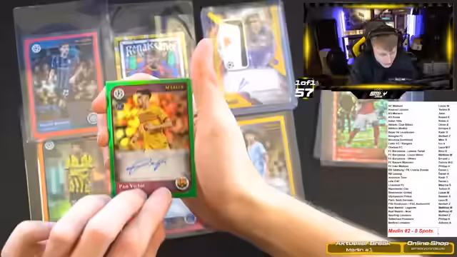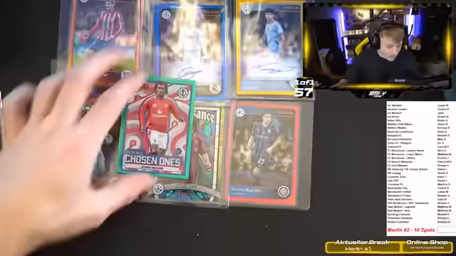 02:01:39Die Live-Öffnung der Merlin-Box beginnt mit zahlreichen Hits. Viele begehrte Karten wie Jude Bellingham (1/250), Martin Ødegaard (1/199), Musa (1/250) und Granit Xhaka (1/199) werden gezogen. Der Streamer betont die große Dichte an hochwertigen und nummerierten Karten in dieser Box und listet die Erfolge für die im Stream anwesenden Spots auf.
