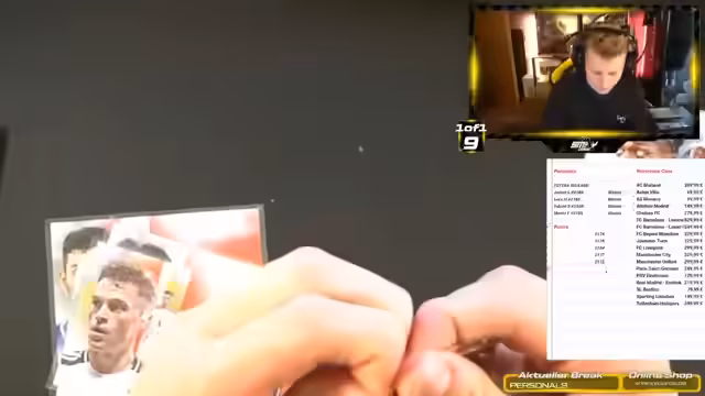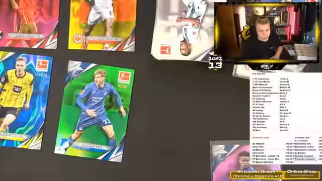 02:49:19Der Stream beginnt mit der Vorstellung der Inhalte des neuen Bundesligas Reverence-Case. Es werden verschiedene Spieler wie Nathaniel Brown, Mathis Zelt und Paul Wanner mit ihren jeweiligen Preisen genannt. Streamer hebt das Set als hochwertig und geisteskrank hervor, warnt aber gleichzeitig vor den sehr gestiegenen Preisen, die den Break in eine sehr teure und riskante Angelegenheit verwandeln können. Die Bewertung des Sets ist durchweg positiv, wird aber als High-End-Produkt identifiziert, bei dem man sich der finanziellen Belastung bewusst sein muss.