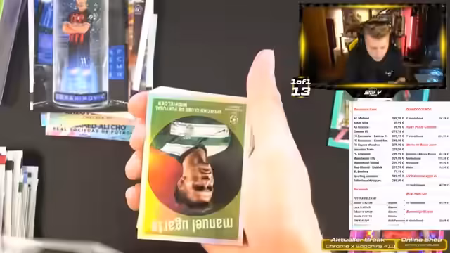 04:38:33Der Stream beginnt mit der Eröffnung von FUTERA und Bundesliga Blaster Boxen. Es werden Karten von Spielern wie Lewandowski, Barella, Kamada und Sané gezeigt und diskutiert. Besonders bei der Bundesliga Box fällt auf, dass sie drei Triple-Autos von Bayern-Spielern enthält, was als extrem glücklich und geisteskrank beschrieben wird. Zudem wird eine neun nummerierte Filmszenen-Karte zu 999 als Highlight erwähnt.