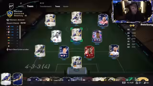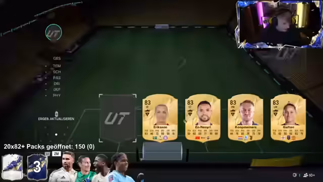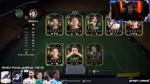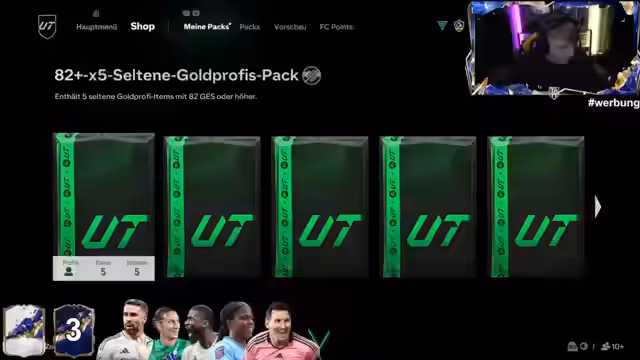 02:49:27Der Stream beginnt mit dem Öffnen von FIFA Packs. Der Streamer ist unzufrieden mit der gezogenen Innenverteidiger-Karte, welche er als geisteskrank und nicht bock beschreibt. Er zieht jedoch einen exzellenten Messi für 475.000 Coins aus dem Shop und fühlt sich durch vorherige 20x82 Plus Packs dafür belohnt. Trotz eines 3-0 Rückstandes im Spiel, ist er motiviert weiterzumachen und verkraftet eine Niederlage. Er zockt weiterhin, um das Future Star Event zu absolvieren und weiteren SPC Content für seinen Verein zu generieren.