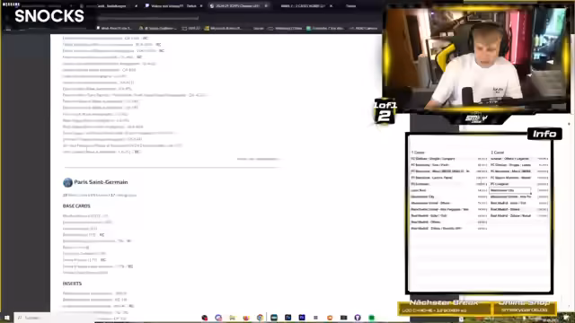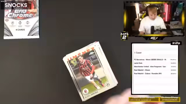 04:07:40Der Streamer führt mehrere Kartensessions durch und öffnet live Boxen und Case. Während des Prozesses gibt er lautes Feedback zu den gezogenen Karten, von überschwänglicher Begeisterung bei seltenen Hits wie einer Topps Rector-Karte oder einem Angel Di Maria Autogramm bis zu großer Frustration über häufige Base-Karten oder "rumgedrehte" Karten, die er als Verarschung empfindet. Er versucht, Hits für bestimmte Vereine oder Spots zu landen, während er die übrigen Karten als Filler für zukünftige Streams verwaltet.