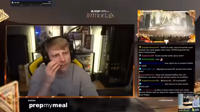 01:09:21Es werden 3x85-Packs geöffnet, in der Hoffnung auf positive Ergebnisse nach Krankheit und Internetausfall. Der Streamer hofft auf durchgängige Streams und gute Packs. McAllister wird gezogen, aber es ist kein Doppelwalkout. Ein weiteres Pack enthält Duel, aber keinen Doppelwalkout. Die 3x85-Packs werden als enttäuschend empfunden. Das 100 Profis-Pack wird geöffnet, und der Streamer ist gespannt auf dessen Qualität. Es wird festgestellt, dass noch keine neue Karte aus dem aktuellen Immortals Team gezogen wurde. Das Pack enthält 48 untauschbare Karten. Der Streamer ist enttäuscht von den wenigen Walkouts und dem Inhalt des Packs. Es wird überlegt, welche SBCs als nächstes gemacht werden sollen, wobei die hohen Rating-Anforderungen problematisch sind. Die Möglichkeit, eine Evo mit Coins oder FIFA Points zu bezahlen, wird positiv bewertet. Der Streamer überlegt, wie die vielen Dinger wegbekommen werden können und macht ein paar. Team of the Week Highlighter Packs werden erwähnt, aber der Chat berichtet von schlechten Erfahrungen damit. Non-Rare-Spieler werden abgestoßen, und ein neues Totsdesign wird erwähnt. Es wird ein Team of the Week gemacht, und der Streamer zieht Kimmich und Musiala. Der Streamer macht kurz die SBC und danach den Rest.