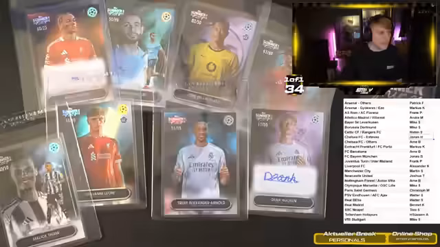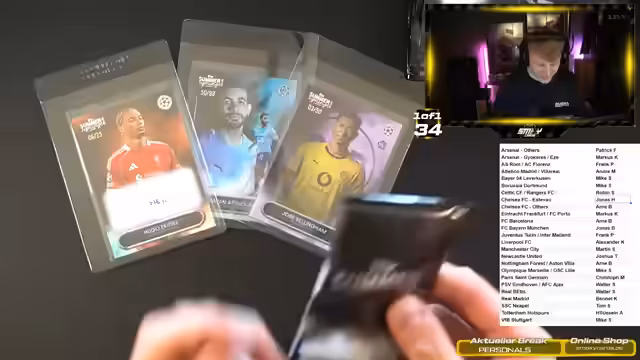 00:07:00Der Stream beginnt mit einer freundlichen Begrüßung des Chats. Es wird der Zeitraum der letzten Abwesenheit erklärt, da kaum große Group Breaks stattgefunden haben. Stattdessen Einzelkarten auf TikTok verkauft und nun wieder auf Twitch gestreamt. Hauptthemen sind neue Einzelkarten, die Megabox von Flagship und die laufenden Summer Signings, bei denen noch mehrere Spots für verschiedene Vereine offen sind.