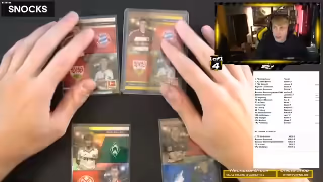 00:15:01Die zweite Box wird eröffnet, welche ebenfalls zahlreiche Hits wie ein Niklas Beste Auto und ein Union Berlin-Spot beinhaltet. Während des Streams werden Diskussionen über das Sammlerhobby geführt. Es wird die Frage diskutiert, ab wann ein teures Hobby wie das Sammeln von Karten nicht mehr als solches zu betrachten ist. Der Streamer argumentiert, dass es sich um ein Hobby handelt, solange die Finanzen im Griff sind und betont den reinen Spielspaß am Produkt.