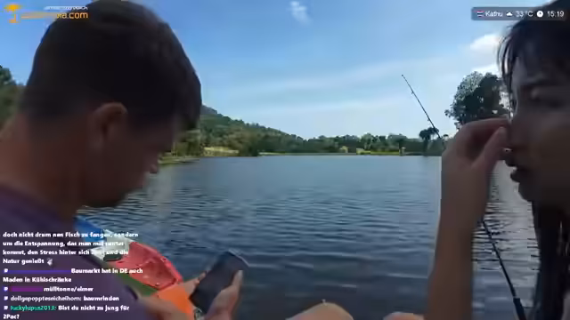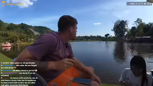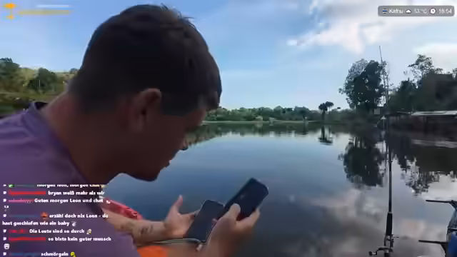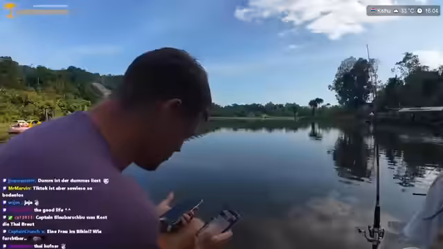 00:10:42Hauptthema des Streams war das Angeln, jedoch gestaltete sich die Fischerei als äußerst schwierig. Die Streamer berichteten, dass die Fische bei der extremen Hitze kaum aktiv sind und sich am Grund aufhalten, was das Angeln fast unmöglich machte. Trotz vieler Versuche mit verschiedenen Ködern wie Würmern, Bananen und Thunfisch konnten nur sehr wenige Fische gefangen werden. Die Wassertemperatur war zu hoch, um Fische anzulocken, und es wurde die Überlegung angestellt, stattdessen in der kühleren Morgen- oder Abenddämmerung zu angeln. Auch der Einsatz einer Schwimmangel wurde als sinnlos angesehen, da der See künstlich angelegt und überall zwischen 10 und 20 Meter tief ist.