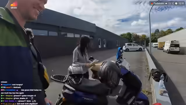 07:14:38Es wird über die Diebstahlsicherheit des Rollers diskutiert, der zwar ein Lenkradschloss hat, aber dennoch leicht zu entwenden wäre. Der Streamer bedankt sich bei Mali für die Tour, auch wenn es manchmal schwierig ist. Er erwähnt, dass er beim letzten Tanken Öl nachgefüllt hat und schätzt die Reichweite des Rollers auf etwa 200 Kilometer im Stadtverkehr, aber weniger bei Vollgas auf Landstraßen. In Münster angekommen, fällt die hohe Anzahl an Fahrradfahrern auf. Der Streamer trifft Tobi, der ihnen Schlafsäcke und warme Kleidung anbietet. Es wird kurz über die Organisation der Sachen gesprochen, bevor der Streamer die Location ausmachen will. Tobi überreicht Mali eine Donauwelle, über die sie sich sehr freut. Der Streamer ist kein großer Kuchenesser, mag aber Käsekuchen und Joghurttorte. Tobi bietet an, dass sie sich wie zu Hause fühlen und sich alles nehmen können, was sie brauchen.