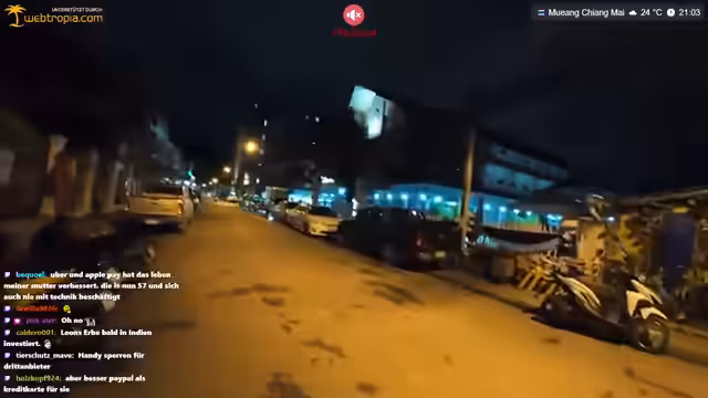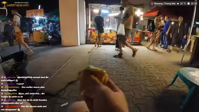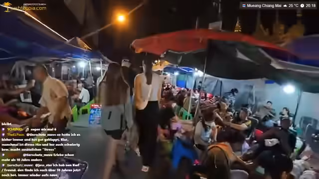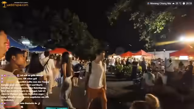06:05:13Es wird vermutet, sich auf dem größten Nachtmarkt Thailands zu befinden, was jedoch später korrigiert wird. Der Markt befindet sich auf einem Tempelgelände, was als ungewöhnlich und interessant empfunden wird. Es wird festgestellt, dass der Markt hauptsächlich von Ausländern besucht wird, während die Verkäufer größtenteils Thais sind. Die Stadt Chiang Mai wird als sehr angenehm beschrieben, mit Ausnahme der fehlenden Nähe zum Ozean und der saisonalen Feldbrände. Ein Versuch, einen großen Gong auf dem Tempelgelände zu läuten, scheitert, da der Sound im Stream nicht hörbar wäre.