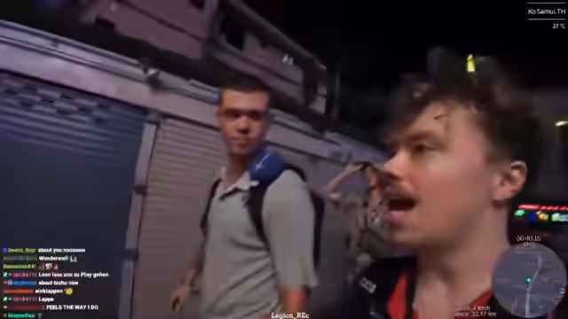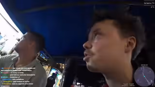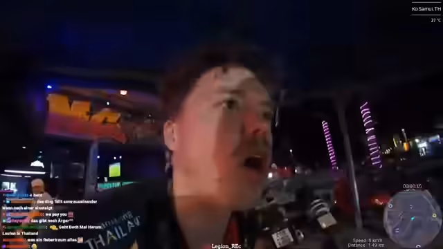 03:14:20Die Streamer interagieren mit Einheimischen und versuchen, kostenlose Fahrten anzubieten, erleben dabei aber Herausforderungen mit Einbahnstraßen und Verständigung. Sie bemerken, dass der Strand Chawang Beach aufgrund einer Fullmoon-Party weniger bevölkert ist. Die Lichtverhältnisse am späten Abend erschweren die Navigation und das Finden des Ziels.