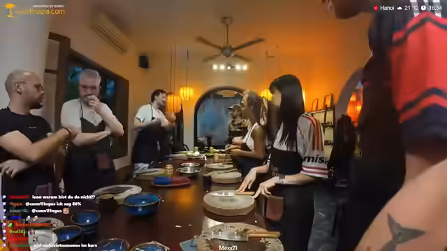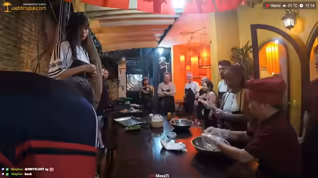 03:27:20Der Streamer und Mali nehmen an einem gemeinsamen Kochkurs teil, bei dem sie eine vietnamesische Hühnersuppe (Phở) zubereiten. Ein internationaler mix aus Teilnehmern, darunter ein Paar aus Kolumbien und der Dominikanischen Republik, kocht mit. Die Kursleiterin führt die Gruppe an und erklärt Schritt für Schritt die Zubereitung, vom Brühen der Knochen bis zum Schneiden des Fleisches. Es wird viel Wert auf das Raucharoma der Zutaten gelegt. Der Kurs ist interaktiv und erfordert die aktive Mitarbeit der Teilnehmer.