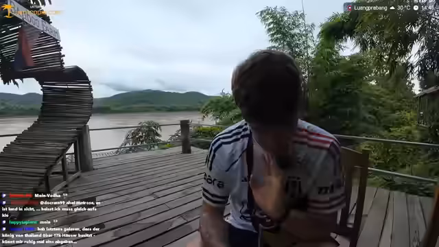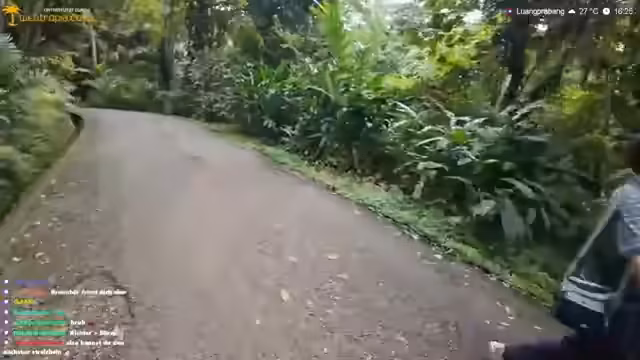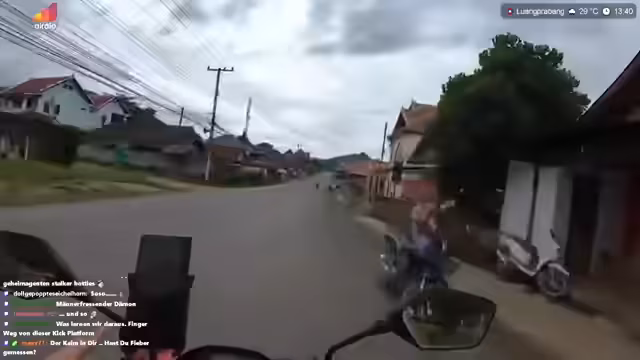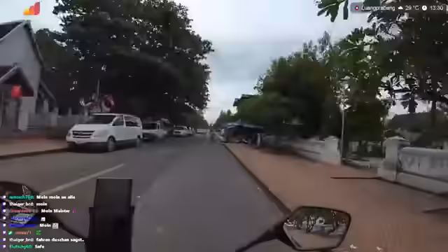 00:07:15Der Stream beginnt mit der Ankunft am Wasserfall in Luang Prabang. Während der Fahrt berichtet der Streamer über technische Probleme mit dem Internet, die durch die Erschütterungen des Rollers verursacht werden. Er fährt mit einem Helm und beobachtet eine chinesische Reisegruppe. Während der Fahrt zeigt er ein Bild seines Rollers und erwähnt, dass er bereits 125 Kilometer zurückgelegt hat. Die Atmosphäre ist entspannt, und er macht sich über die unterschiedlichen Straßenzustände im Vergleich zu Deutschland lustig.