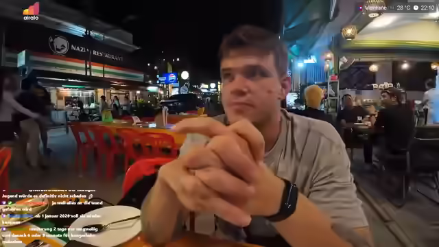 04:50:19Es wird über die Planung des Sabaton-Streams gesprochen, der zusammen mit Tobi gemacht wird, und dass Subs mehr Minuten bekommen werden. Es wird vermutet, dass eine Sim-Karte abgelaufen ist und ein Besuch im Shop notwendig ist. Der Sabaton-Stream mit Tobi wird als legendär erwartet, obwohl dies wahrscheinlich weniger Einnahmen bedeutet. Es wird überlegt, mit Tobi für die ersten zwei Wochen eine Wohnung auf Phuket zu suchen, um Kosten zu sparen. Der Streamer äußert den Wunsch, etwas zu essen, hat aber keine Lust, irgendwo im Stehen zu essen. Er bemerkt einen Hund im Wasser und fragt sich, ob Radu noch in Thailand ist, um zu vermitteln. Es wird erwähnt, dass man in Wang Vieng hätte länger bleiben sollen, wenn man gewusst hätte, dass man so lange in Thailand bleibt.