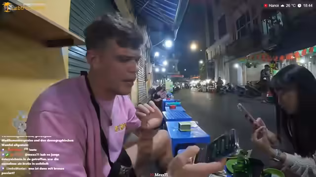 02:01:15Der Stream beginnt mit der Rückkehr der Mutter des Streamers aus dem Vietnamurlaub, die nach einer dreiwöchigen Reise gemeinsam mit ihm um 6 Uhr deutscher Zeit gelandet ist. Die Reise führte sie von Hanoi nach Halong Bay, Ninh Binh, Dong Hoi und weitere Orte. Das Reisen wird als gelungen und positiv beschrieben. Im Anschluss unterhält sich der Streamer mit dem Chat über einen frischen Mango-Juice, den er als sehr lecker empfindet.