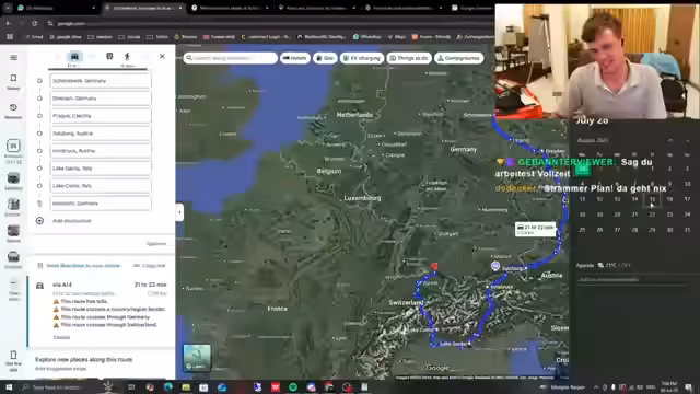 01:34:41Die gemeinsame Planung der Reiseroute beginnt in Discord. Als Startort für die Wohnmobil-Tour wird Schönebeck bei Magdeburg festgelegt. Eine detaillierte Route wird skizziert: von Schönebeck über Leipzig nach Dresden, dann weiter nach Prag und in die Schweiz. Die Diskussion umfasst geplante Ziele wie das Zürich Street Festival, den Bodensee und Seen in der Schweiz sowie Italien.