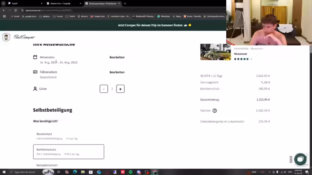 00:01:07Im Stream wird die Planung einer Wohnmobilreise für den Zeitraum vom 14. bis 24. August detailliert besprochen. Die Route führt von Frankfurt nach Dresden, über Prag, Salzburg, Innsbruck, den Kadersee und Zürich mit einer Gesamtdistanz von etwa 2000 Kilometer. Die Reisegruppe besteht aus Leon, Tobi und dessen japanischer Freundin. Nach längerer Suche und mehreren Absagen wird ein Wohnmobil des Typs 'Freiraum Reh' für 1225,95 Euro gebucht. Die Fahrer, Leon und Tobi, verfügen beide über Erfahrungen mit Wohnmobilen und einen gültigen Führerschein.