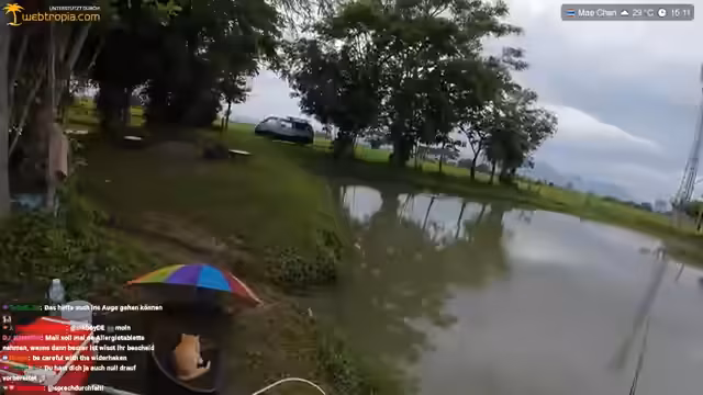 02:00:15Während der Streamer am Ufer des Sees versucht, mit einem Wurm als Köder zu angeln, setzt unerwartet starker Regen ein, was die bereits angespannte Situation weiter verschärft. Gleichzeitig stellt sich eine neugierige Katze an den Angelplatz und stört den Streamer massiv, indem sie seinen Sitzplatz blockiert und ihm auf den Arm steigt. Dies führt zu einer humorvollen, aber frustrierenden Interaktion, in der der Streamer die Katze zwar hasst, aber gleichzeitig bemerkt, dass diese ihn augenscheinlich sehr mag und nicht weggehen will.