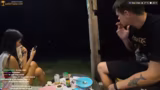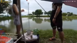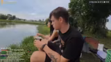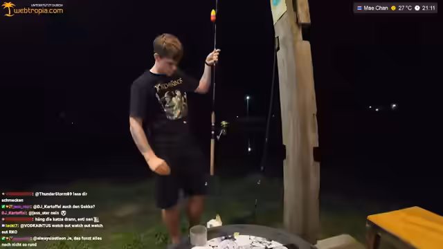 02:26:15Nachdem die Freundin Mali improvisatorisch einen Stein als Gewicht für die Angelrute befestigt hat, kann der Streamer endlich etwas weiter auswerfen. Anschließend fischt er mit einem Wurm als Köder und einen Schlüssel als Gewicht. Er hat einen Fisch angebissen, der jedoch zu klein ist und sich als halb durchsichtiger 'Babyfisch' herausstellt. Während der Streamer den Fisch an Land holen und photographieren möchte, geht ihm der Fang versehentlich wieder zurück ins Wasser, was zu einem erneuten Schrecken führt.