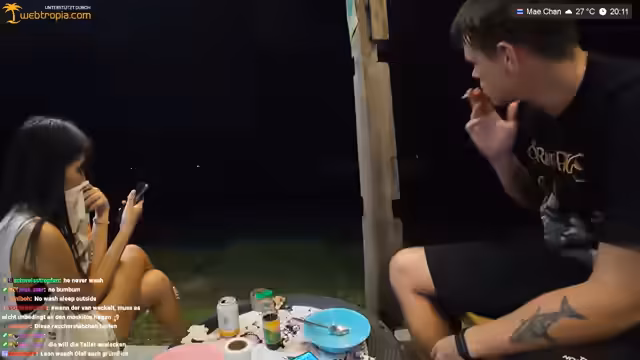 00:05:29Der Streamer erreicht mit seiner Freundin Vanessa den Campingplatz an einem See in Thailand. Das Ziel sind zwei entspannte Tage Campen und Angeln. Nach der Ankunft beginnen sie sofort mit dem Einrichten des Lagers: Zwei Baustrahler werden als Beleuchtung aufgestellt und die Nutzung einer vorhandenen Küche und eines Badezimmers wird erwähnt. Die Solaranlage des Vans liefert zunächst unter einem Baum nur 7 Watt, was aber als ausreichend betrachtet wird, da über Nacht keine Streaming-Aktivitäten geplant sind.