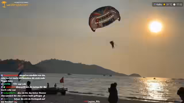 03:39:21Ein besonderes Highlight des Streams sind die Beobachtungen von Paragleitern am Strand. Die Streamer kommentieren fasziniert, wie die Piloten sich in luftiger Höhe an Seilen hängen und landen. Es wird diskutiert, ob man selbst diese Aktivität nachstellen könnte. Ein weiterer Fokus liegt auf einem DJ, der am Strand von Patong auflegt, was für eine kostenlose Party-Atmosphäre sorgt. Auch ein Segelboot namens Jona Boat wird bewundert.