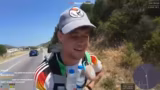 08:05:51Der Streamer interagiert mit vorbeifahrenden Bussen und LKWs, die er als 'Bären' bezeichnet. Er beschreibt seinen mentalen Zustand als einen 'Modus', in dem er trotz Schmerzen und Blasen weiterläuft. Die Motivation sind 'die Kohle, die Ehre und die große Liebe'. Ein kurzer Streit mit einem Hund, den er als 'gefährlich' und ängstlich beschreibt, unterbricht die Laufstrecke.