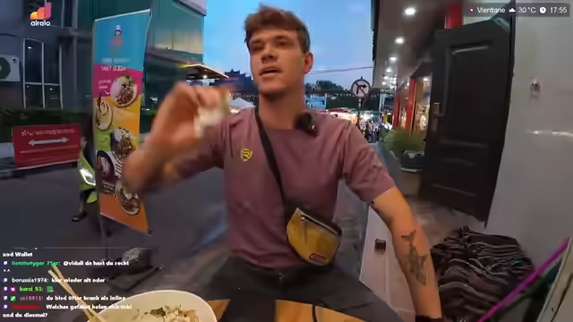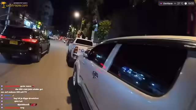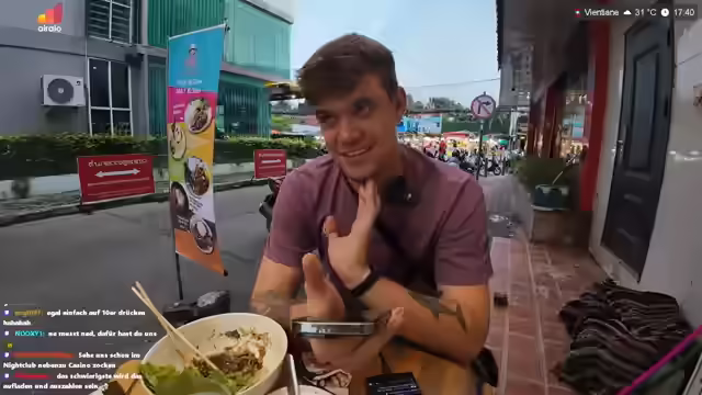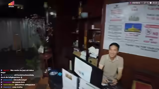03:13:32Laos wird als Mini-Land mit wenigen Einwohnern beschrieben, was sich auf das Partyangebot auswirkt. Die Hauptstadt hat laut Google etwa 350.000 Einwohner, mit umliegenden Bezirken vielleicht eine halbe Million. Es wird über den günstigen Preis von Zigaretten gesprochen: Eine ganze Packung Bastos kostet umgerechnet 24 Cent bzw. 6.000 laotische Kipp. Die Zigaretten schmecken akzeptabel, sind aber etwas schwächer als deutsche Marlboro, wobei der Streamer sie als nicht schlecht empfindet. Es folgt die Ankündigung einer Pinkelpause im Dunkeln, da keine Toiletten in der Nähe sind, während im Hintergrund eine Party stattfindet.