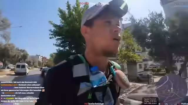 00:14:11Der Stream beginnt mit Verspätung, da der Streamer länger als geplant für seinen Startvorbereitungen gebraucht hat. Er erwähnt, dass er gestern sieben Kilometer gelaufen ist, und steht nun vor der Entscheidung, ob er noch zum Weltwuder aufbricht oder Google Bilder betrachtet. Die Entscheidung soll vom Zuschauer Thomas abhängig gemacht werden. Für die heutige Tour sind 40 Kilometer anvisiert, um den gewünschten Durchschnitt zu erreichen. Die Wetterprognose liegt bei 36 Grad Celsius, was die Herausforderung erheblich erhöht.