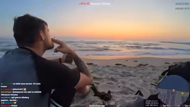 11:24:15Bei strahlendem Sonnenuntergang am Meer beschließt der Streamer spontan zu baden, was er als 'episches Schwimmen' bezeichnet. Der Sprung ins kalte, salzhaltige Meer ist für ihn ein intensives Erlebnis. Gleichzeitig sind technische Probleme, wie das Verbinden mit der Kamera, ein ständiger Begleiter und führen zu abenteuerlichen Momenten, in denen er fürchtet, das Live-Signal zu verlieren.