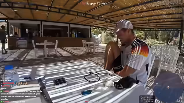 05:13:23Ein Zuschauer schlägt die Banjul Rallye vor, eine Rallye von Dresden nach Gambia, die ca. 900 Euro pro Person kostet und ein Allradauto erfordert. Der Streamer zeigt großes Interesse an diesem Abenteuer, insbesondere an der Idee, eine billige Schrottkiste zu kaufen und das Ziel zu erreichen. Seine Bedenken betreffen jedoch die Absicherung bei Pannen in fremden Ländern, die eventuell hohen Kosten für Reparaturen oder die Entsorgung des Fahrzeugs sowie die unklare Regelung bei der Einreise mit älteren Fahrzeugen.