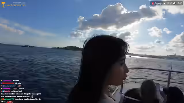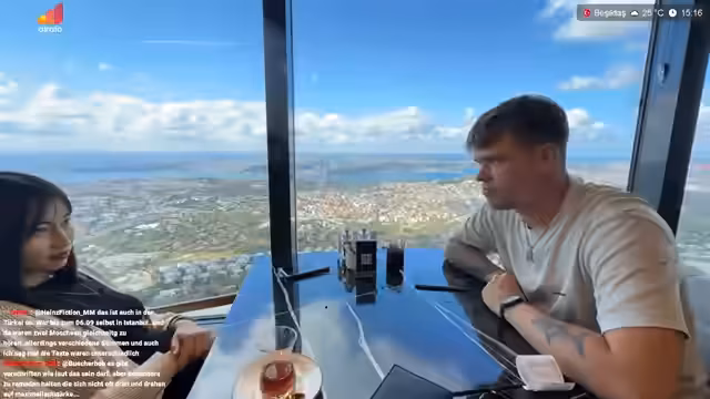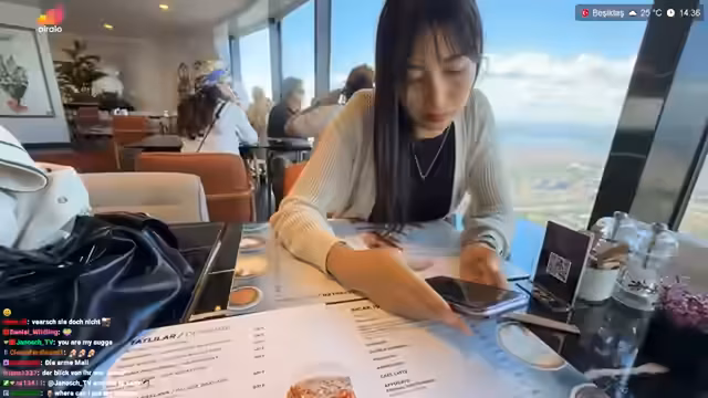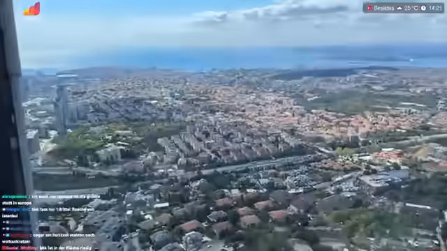 03:00:34Es wird die Planung eines Besuchs der Prinzeninseln am Dienstag erwähnt. Der Streamer bewundert die Straßen Istanbuls von oben und überlegt, ob es dort Bademöglichkeiten gibt. Er lobt die Streamqualität des iPhone 16 Pro, merkt aber an, dass es schnell heiß wird. Es folgt ein kurzer Austausch mit Mali über ein Foto. Der Streamer fragt Mali nach einer Gegenleistung für die schöne Aussicht. Er bestellt Cheesecake und Brownie in einem Café im Turm. Es wird über die Möglichkeit einer Live-Übertragung der eigenen Hochzeit gesprochen. Es wird überlegt, ob ein Brownie oder Cheesecake bestellt werden soll, und beide werden schließlich zusammen genommen. Der Streamer wundert sich, dass Mali keine Energy Drinks oder Kaffee trinkt und schlägt Chai Tee vor. Er bestellt Cheesecake-Schokolade, Brownie, Fincan Chai und normalen Chai.