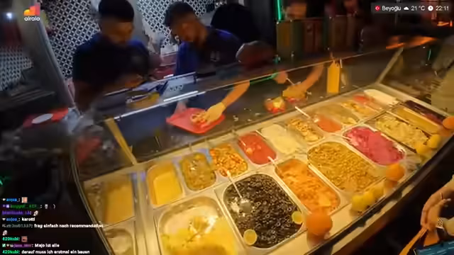 10:50:34Die beiden probieren verschiedene türkische Spezialitäten wie Kumpir (gefüllte Kartoffeln) und Kokoreç (gefüllte Lammmagen). Die Zubereitung von Tzatziki und anderen Beilagen wird detailliert gezeigt und diskutiert. Der Streamer stellt fest, dass die Food-Szene vielfältig ist und man je nach Vorlieben einfache oder komplexe Gerichte wählen kann, und zeigt dabei sowohl Begeisterung als auch gelegene Skepsis gegenüber neuen Geschmäckern.