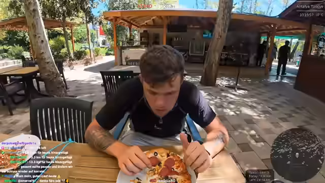 10:56:31Aufgrund der zurückgelegten Kilometerschaft und des hitzewetteres ist der Streamer hungrig und sucht nach einem Restaurant. Er findet ein Fischrestaurant, ist aber unsicher, ob er einen ganzen Fisch allein essen soll, da es sich um ein teures Gericht handelt, das normalerweise für mehrere Personen gedacht ist. Letztlich entscheidet er sich gegen einen Fisch und bestellt ein Café de Paris mit Fleisch. Nach der Mahlzeit muss er noch mehrere Kilometer zum Hotel laufen und beklagt dabei wiederkehrende Schmerzen.