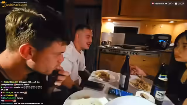 11:20:06Die Streamer bereiten gemeinsam Nudeln zu und diskutieren über die Zubereitungsmethode. Es gibt Diskussionen über die Menge des Essens und wer mehr davon bekommen soll. Tobi äußert Bedenken, dass das Essen vergiftet sein könnte, während Mali versichert, dass alles in Ordnung sei. Die Streamer teilen die Nudeln auf und essen danach zusammen.