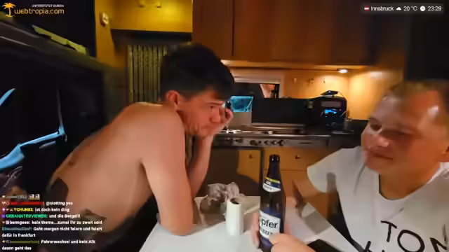 13:02:09Das Wohnmobil beginnt zu wackeln, was den Schlaf der Streamer beeinträchtigt. Sie diskutieren über die Ursache der Bewegungen und ob es sich vermeiden lässt. Der eine Streamer fühlt sich gestört, während der andere betont, dass dies normal sei. Es wird humorvoll angedeutet, dass Bewegungen durch bestimmte Aktivitäten verstärkt werden könnten, was zu einer Unterhaltung über 'no sex tonight' führt.