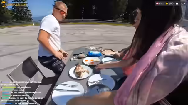 01:22:44Die Streamer essen den gegrillten Fisch und Hähnchen in malerischer Bergkulisse. Sie diskutieren über die verschiedenen Fischarten und die Zubereitung. Tobi ist begeistert vom Geschmack und vergleicht das Essen mit thailändischer Küche. Sie unterhalten sich über Lebensgewohnheiten, Camping und die Vorlieben beim Frühstück. Während des Essens bemerken sie, dass es sehr heiß wird und überlegen, in den Schatten zu wechseln.