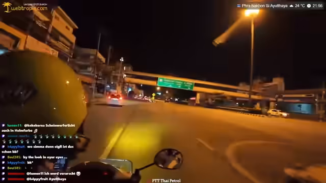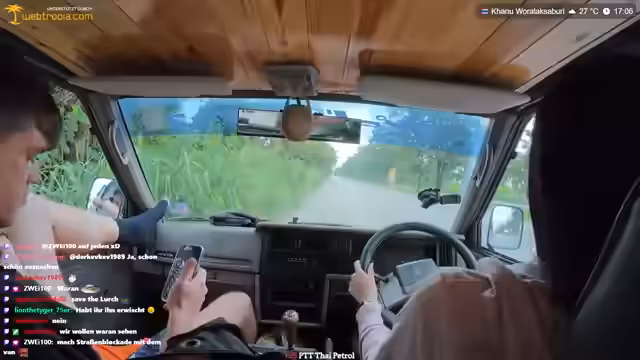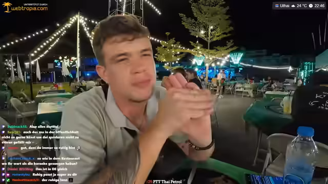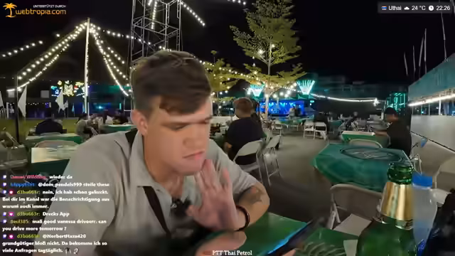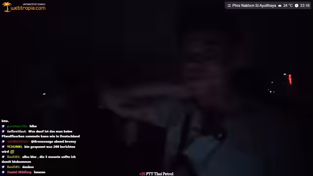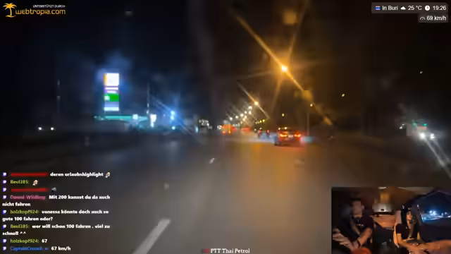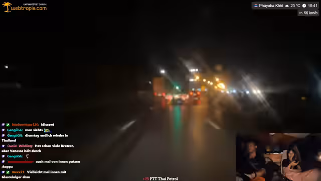 04:55:28Katja unterstrich Kreisch raidet den Stream mit 70 Leuten, wofür sich der Streamer bedankt. Kurz darauf kommt es zu einer Diskussion über das Rollerfahren in Thailand, wobei der Streamer kritisiert, dass ein Fahrer gegen die Verkehrsordnung fährt und er den 'Scheißfahrer' erwischt hat. Er fragt, ob man die 'NC' (wahrscheinlich eine Einstellung) ausmachen kann, während er seinen Unmut über die Fahrweise zum Ausdruck bringt. Dies führt zu einer kurzen Unterbrechung, in der er sich über die Situation ärgert und die Zuschauer an der Situation teilhaben lässt. Die Szene verdeutlicht die Herausforderungen und den Ärger, die im thailändischen Straßenverkehr entstehen können, insbesondere wenn man auf Fahrdienste angewiesen ist.