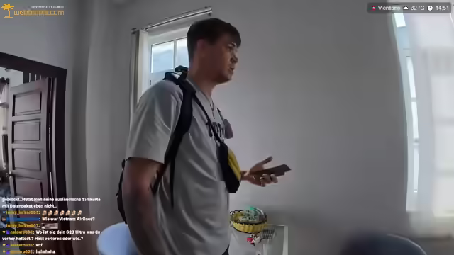 00:07:27Der Streamer ist gestern Vormittag in Laos angekommen, doch die Anreise war von erheblichen Schwierigkeiten geprägt. Bereits in Deutschland begann das Chaos: Der erste Regionalzug kam pünktlich, doch der folgende ICE in Fulda hatte 20 Minuten Verspätung, da fünf Mitarbeiter nicht erschienen waren. Nach weiteren 20 Minuten wurde bekannt gegeben, dass der Zug nach Frankfurt nicht weiterfahren würde und auch kein Anschlusszug zur Verfügung stand. Der Streamer und Mali mussten sich selbst um eine Alternative kümmern. Sie fanden einen Regionalzug nach Frankfurt Hauptbahnhof, der jedoch auf einem anderen Gleis abfuhr und nur eine Minute Zeit zum Umsteigen ließ. Dies führte zu einem Sprint durch den Bahnhof, um den Anschluss nicht zu verpassen. Trotz der Bemühungen war die Zeit knapp, da der Flug um 13:55 Uhr ging und sie erst gegen 12:00 Uhr in Frankfurt waren.