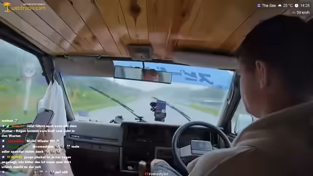 04:14:17Während der Fahrt kommt es zu starkem Regen, was die Sicht im Fahrzeug stark einschränkt, da die Fenster beschlagen sind. Ein Öffnen der Fenster ist aufgrund des fehlenden Regenschutzes nicht möglich, da der Regen direkt hereinschlagen würde. Gleichzeitig treten Probleme mit der Fahrzeugbeleuchtung auf, die zwischen Abblend- und Fernlicht schwankt. Nachdem ein Kabel lose herumhängte, stellt sich heraus, dass das Fernlicht nach dem Anfassen des Kabels wieder funktioniert, was zu der Annahme führt, dass die Kabelverbindung die Ursache für die Lichtausfälle war.