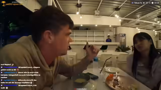 10:56:52Das erste Treffen zwischen Streamer und Mali war zufällig. Sie lernten sich in einem Nudelladen kennen, nachdem sie sich auf Tinder gematcht hatten. Beide kamen direkt nach der Arbeit und waren müde. Mali kam in Schlafanzughose. Die Beziehung begann nicht als klassisches Date, sondern durch eine spontane Einladung zum Essen. Später wurden Geldtransaktionen thematisiert.