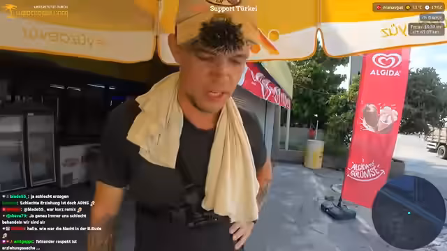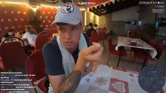 00:06:18Der Stream beginnt spät in der Nacht mit Begrüßungen und geht direkt auf das Hotel ein, das der Streamer als das schlechteste der gesamten Türkei bezeichnet. Das Frühstück wird als unter aller Würde beschrieben, mit Käse, der wie Gummi schmeckt und stark überteuertem Wasser. Der Streamer beschreibt seine极度 Frustration über die schlechte Qualität und den Service des Hotels.