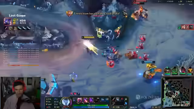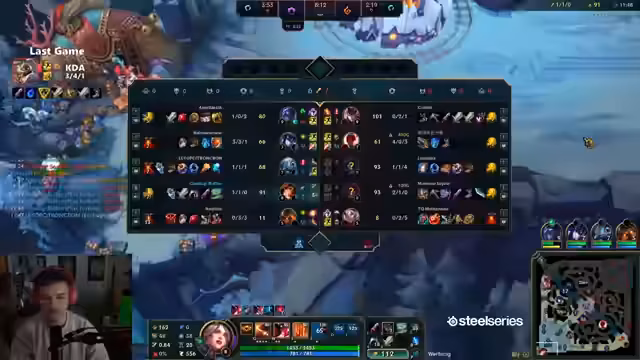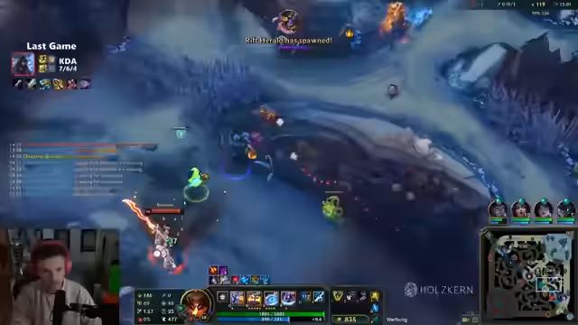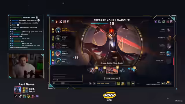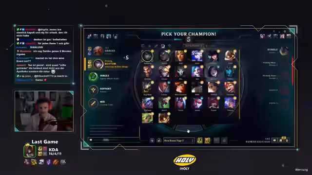 00:30:00Nach dem ersten Spiel wechselt der Streamer die Rolle und spielt Draven Midlane. Während des Champion-Picks erwähnt er kurz ein neues Challenger-Ratevideo von Phil, das er sich anschauen will. Das zweite Spiel verläuft ähnlich frustrierend: Er stirbt früh gegen Bratwurstwasser (Shaco) und das Team hat große Probleme. Der Streamer unterbricht den Spielverlauf, um sich das Challenger-Ratevideo anzusehen. Die Rateraten geben ihre Peak-Ranks und LP an (z.B. 1213 LP, Rang 150). Nach dem Video geht es weiter mit dem Spiel, das jedoch erneut verloren geht, trotz guter Leistung des Streamers.