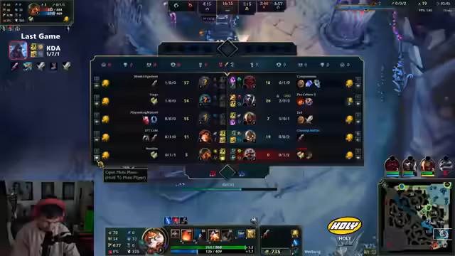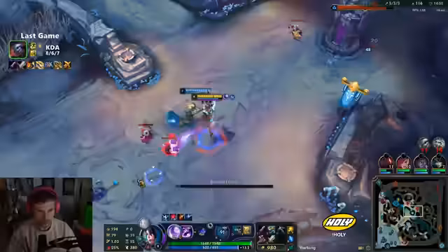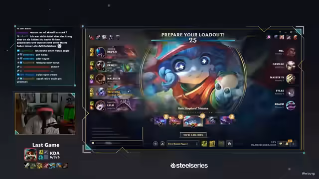05:13:26In einem neuen Spiel pickt der Streamer Aphelios und bemängelt sofort die Wahl des Supports (Nami gegen Blitzcrank/Tristana). Er analysiert die Lane-Situation kritisch und bemerkt ungewöhnliches Verhalten der gegnerischen Kiana, die Minute 4:30 unerwartet im Botlane auftaucht. Trotz anfänglicher Vorsicht verliert er den Lane und beschwert sich über mangelnde Koordination. Als das Spiel sich zuspitzt, verliert er trotz ultimativem Einsatz und beklagt erneut die Hilflosigkeit der ADC-Rolle. Der Stream endet mit der Ankündigung, weiterzuspielen, bis ein 'geiles' Game gelingt – oder der Stream zu Ende geht.