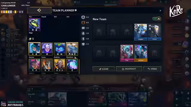 05:10:37Aufgrund von mehreren Niederlagen und fehlenden Items wird die laufende Composition mehrfach geändert. Der Fokus wechselt von Anima Squad zu One for All und später zu Bruiser-Setups wie Kobuko und Shora. Die Anpassungen erfolgen dynamisch, basierend auf der,item-Verfügbarkeit und der Konkurrenz im Lobby.