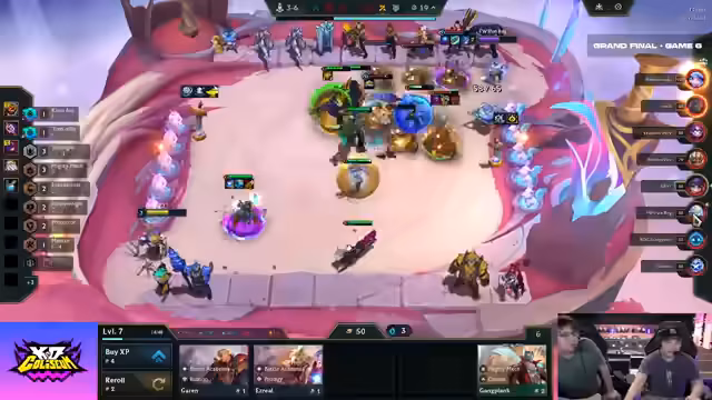 02:03:35Die Spieler entwickeln ihre Builds basierend auf den erhaltenen Augments und Items. Tomino versucht, ein gutes Board zu spielen und auf Kog'Maw zu setzen, da seine Komponenten gut dafür geeignet sind. Er hat die Option, JG-Slam mit Open Belt zu spielen, um Nashors zu bekommen, oder mit Träne auf Soge zu gehen. Without You spielt Level Up in der Prismatic Prelude Region mit neun Jax und Juggernaut, während Terry und Ironbock Quality over Quantity spielen, was oft mit vertikalen Synergien wie Star Guns oder Soul Fighters kombiniert wird. Sangyob setzt auf Shimmer Scale Essence mit Mogusman auf Garen, aber ohne weitere Tank-Items oder Power-Ups, was das Gold-Farmen erschwert. Soul spielt Golden Edge of Sire, Edge Lord mit Radiant Steraxx, Anime Visage, Zek und Rage-Blade-Star 2, was sehr stark aussieht. Die verschiedenen Ansätze zeigen die Vielfalt der Strategien im Finale.