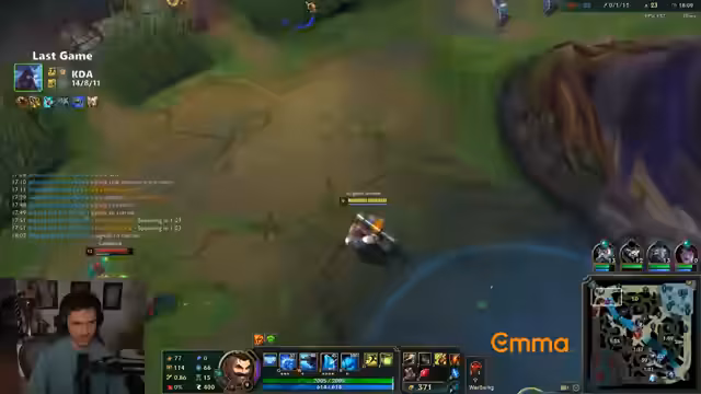 00:07:03Das erste Spiel beginnt mit dem Supports Kaiser Braum gegen Draven Karma auf der Bot-Lane. Der Streamer analysiert das schwierige Matchup und betont die Notwendigkeit, die HP-Leiche zu traden, damit der Kaiser Farm erhalten kann. Trotz eines schlechten Starts verläuft die Lane überraschend gut, doch der Streamer kritisiert den Spielstil des Kaisers als 'straight up shit' und 'really bad'.