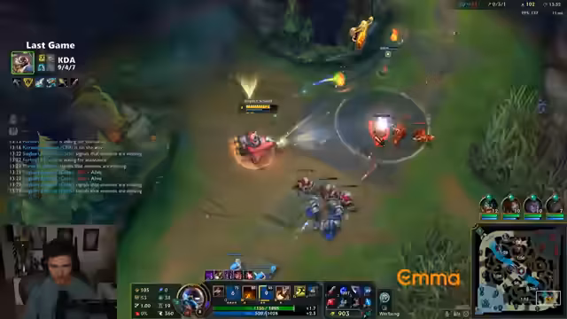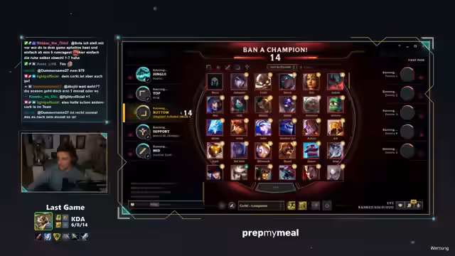 00:13:21Nachdem das Team einen Vorteil erlangt hat, diskutiert der Streamer über taktische Züge. Er entscheidet sich, die Bot-Lane nicht zu riskieren und stattdessen nur defensiv zu spielen, da der gegnerische Draven stark gefeedet ist. Es folgen Diskussionen über Roaming-Möglichkeiten, die Schwierigkeiten, Karte zu lesen, da TP auf der Minimap nicht mehr sichtbar ist, und das aggressive Drücken der Lanes.