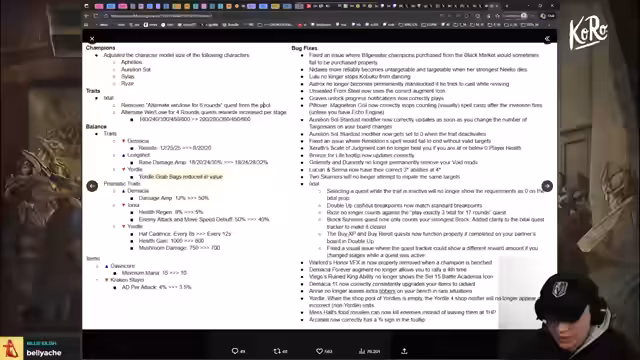 00:24:03Die Patch Notes enthalten zahlreiche Balanceänderungen. Demacia erhält weniger Resistenzen, während Longshot und Kaiser gebufft werden. Yordle-Grabbags werden genervt, indem ihr Wert, ihr HP und ihre Loot-Regen reduziert werden. Einzelne Champions wie Miss Fortune, Caitlyn, Diana und Illaoi wurden gebufft, während andere wie Jax und Cerat genervt wurden. Kraken-Slider wird im Zusammenhang mit der starken Junara gedämpft. Auch Item-Änderungen wurden vorgenommen, wie die Reduzierung des Minimum-Manas für Items und die Entfernung von Accelerate Augment.