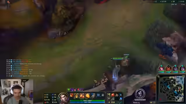 00:05:48Der Streamer beginnt ein Spiel mit Kaiser auf der Bot-Lane, was sich schnell als schwierig erweist. Er kämpft besonders gegen ein Fiddlesticks Support, der ihn mit ständigen Pokes und seiner Ultimate massiv behindert. Das Hauptproblem ist, dass Kaiser nicht in der Lage ist, den ersten Angriff zu initiieren, da er sofort kontrolliert wird und nutzlos wird. Der Streamer ist frustriert über die Schwäche des Champions in solch einer Lane, die es unmacht, Fights zu erzwingen, und das gesamte Spiel kontinuierlich verliert.