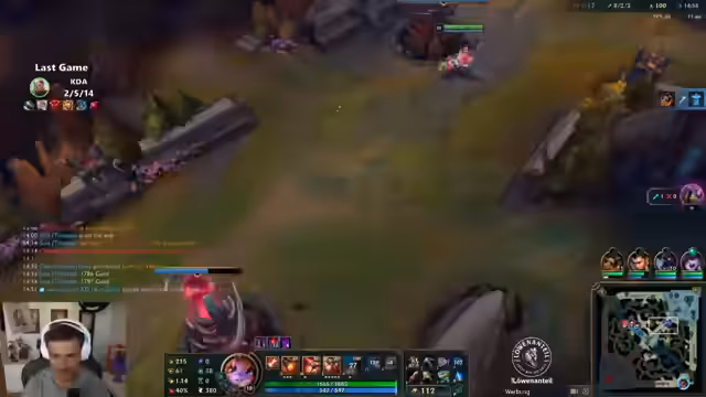 01:49:37Der Streamer analysiert ein weiteres verlorenes Spiel, das er mit einem schrecklichen Draft beginnt. Sein Team hat kaum Crowd-Control, was Engage extrem schwierig macht. Der Gegner nutzt Champions mit unendlichem Skalieren wie Nasus und Aurelion Sol, die durch die Patch-Änderungen zwar weniger stark sind, aber dennoch eine große Bedrohung darstellen. Er kritisiert die gegnerische Teamkommunikation und strategische Fehlentscheidungen, die das Spiel frühzeitig in eine negative Richtung gelenkt haben und führt am Ende zu einer unangenehmen Niederlage.