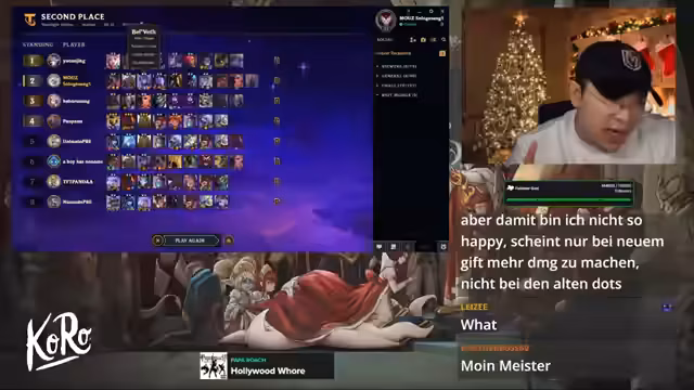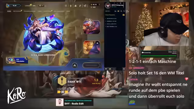 02:36:03Nach dem Sieg wird festgestellt, dass der Client verbuggt ist und Screenshots manchmal nicht möglich sind. Der Streamer speichert die Screenshots im Lobby-Channel. Es wird eine Einschätzung zum neuen Set gegeben: Es macht 'hunderttausend mehr Spaß als 15'. Die Quest in 'Ischtal Solo' skaliert mit der Stage, und die meisten Quests müssen bis Kampfende erfüllt werden. Es wird betont, dass das Augment 'komplett broken' ist. Es wird erklärt, dass die 'Champions Queue TFT Challenger Queue' auf dem Testserver mit den LP-stärksten Spielern und Pro-Spielern aus der ganzen Welt stattfindet, die einen direkten Platz erhalten, unabhängig von ihren LP. Der Streamer wurde eingeladen und ist im Spiel. Er konzentriert sich auf das Spiel und plant, zwischen den Spielen kurze Fragerunden zu machen, da er im Spiel voll fokussiert sein muss. Er muss nicht scouten, da er zuerst seine eigenen Kompositionen spielen muss. Er plant, nur das zu spielen, was er kennt, und 'First Damm Ishtal' zu optimieren, einschließlich 'Transition', 'Early-Mid-Game', 'Late-Game', 'Rolldowns', 'Execution', 'Item-Vergabe' und 'Positioning'. Er verliert ein Spiel und überlegt, wie er weiter streaken kann, indem er 'Kiana' und 'Briar 2' findet. Er plant, 'Yasuo' zu spielen, um eine Chance auf vier 'Slayer' im Early Game zu haben, und 'Bilgewater' zu sammeln. Er überlegt, ob er rollen soll, um 'Kiana' und 'Briar 2' zu finden und durchzustreaken. Er ist 'full try-chat' und grindet LP. Er wird zwischen den Spielen Fragen beantworten und zusammenfassen, was er gelernt hat. Er benötigt 'Chain Edge of Night' und überlegt, 'Brot' zu reforgen, um Tank-Items zu bauen oder 'Healing Items' für später. Wenn er sechs 'Slayer' spielt, benötigt er nur 'Hand of Justice'. Er muss 'Gangplank' finden, um 'Bilgewater' mitzunehmen. Er pusht Level 6 und verliert trotzdem. Er muss 'BT' bauen oder sechs 'Slayer' spielen. Er hat 'Econium Augment' und keinen 'Bilgewater'. Er muss 'BT-Hodge' auf dieselbe Unit machen und 'Gangplank' finden. Er spielt 'Xeon' bevor er 'Swain' hitzt. Er ist Letzter und sucht 'Fiddlesticks', 'Shivana', 'Cloak Quicksilver'. Er wird 'Kiana' sofort verkaufen und die beiden anderen Einheiten einsetzen.
